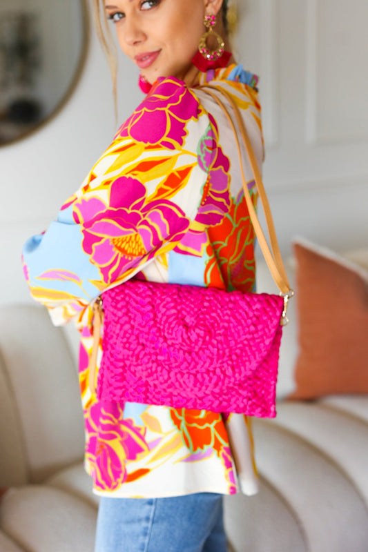 Fuchsia Raffia Woven Wrist Strap Clutch Bag
