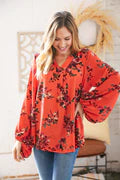 Cardinal Red Frilled Mock Neck Floral Puff Sleeve Top