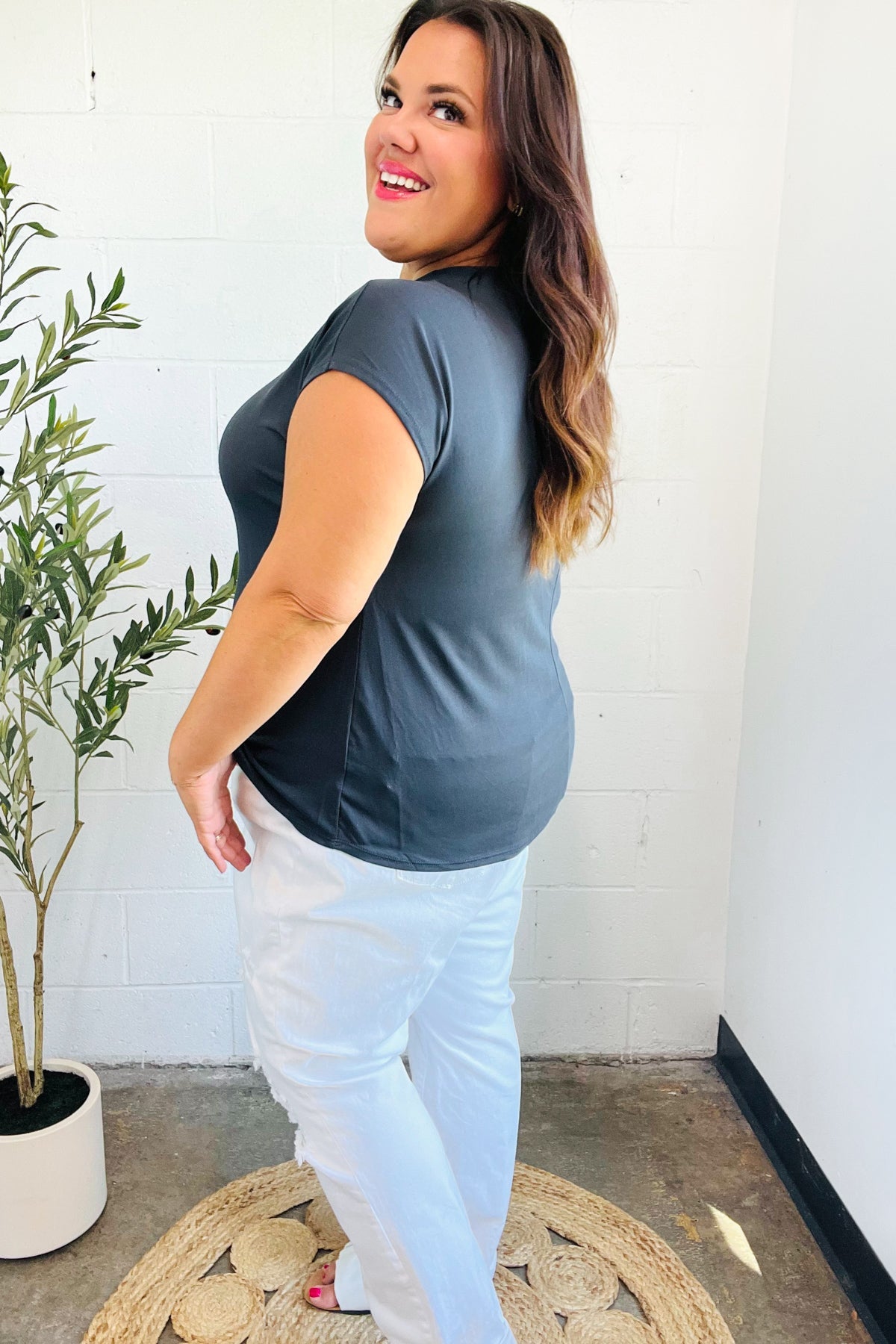 Charming In Charcoal Asymmetrical Shirred Drop Shoulder Modal Top